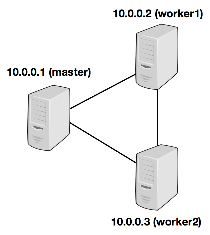 以下例子展示了三个节点(IP 地址从 10.0.0.1 到 10.0.0.3,主机名为 master、worker1、 woker2)的设置,以及配置文件(在所有机器上都需要在相同路径访问)的内容: